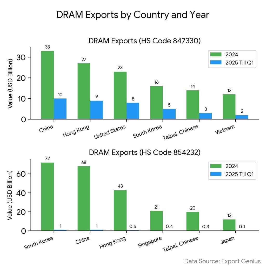 | Exporters of DRAM (HS Code 847330) | Value (2024) | Value (2025 Till Q1) | Exporters of DRAM (HS Code 854232) | Value (2024) | Value (2025 Till Q1 |