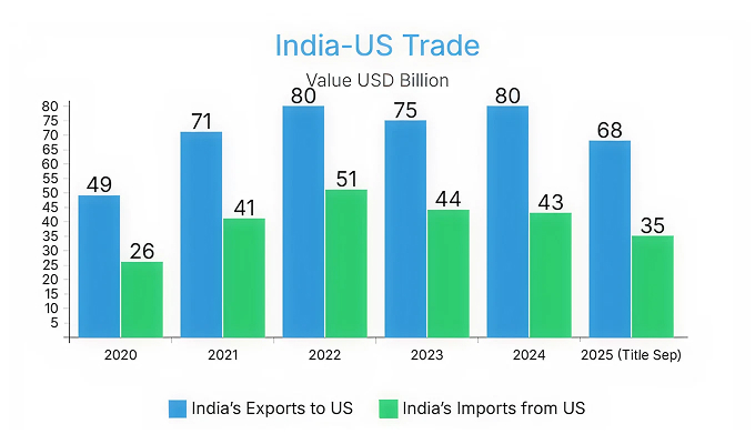 India and the United States share one of the most significant bilateral trade relationships in the world, with total goods and services trade reaching over $212 billion in 2024, up more than 8% year-on-year. India’s exports to the US totaled about $80 billion, while imports from the US reached $41 billion, resulting in a substantial trade surplus for India.